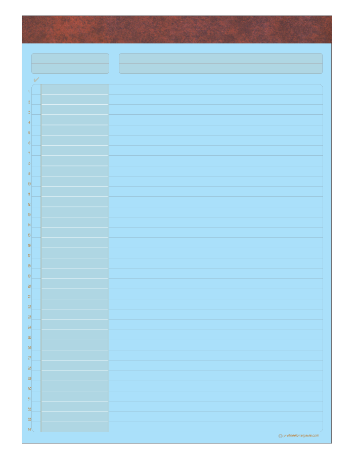 8 1/2" x 11 3/4" Pads. Smooth #24 Bond/#60 Offset, 30% Recycled Paper, 80 Point Chipboard Back, Brown Marble Leatherette Tape Binding.